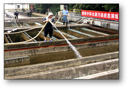 5月28日上午,襄陽中環(huán)水務(wù)米公水廠開展了一場(chǎng)“水源污染應(yīng)急演練”?!把菥殹蓖ㄟ^該廠位“漢江取水口水源地突遭不明原因污染”,城市供水“被迫緊急停止” …… 。圖為演練過程中,米公水廠員工利用多支高壓水槍,對(duì)水廠“被污染水池池面、管道” 等進(jìn)行全面、徹底的清洗?!把菥殹?/SPAN> 進(jìn)一步提高了企業(yè)員工處置突發(fā)事件的思想意識(shí)和能力。