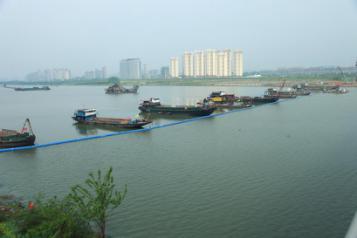 4月10日上午10點(diǎn),13艘作業(yè)船分布在供水管道的各個(gè)吊點(diǎn),開始進(jìn)行注水沉管作業(yè)。為控制管道的水量流速,每注水一次10分鐘,暫停約15分鐘。施工方根據(jù)管道和每個(gè)吊點(diǎn)的受力情況,從南岸往北岸注水,船上每一個(gè)吊點(diǎn)根據(jù)水量調(diào)節(jié)逐漸下沉。由于河床差異,鋼管需要沉入水下十幾米,對(duì)施工技術(shù)要求很高,整個(gè)過程持續(xù)了六個(gè)小時(shí)。