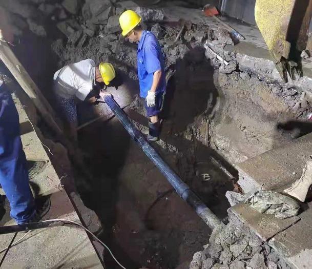 DN600管徑是襄城輸配水主管線,炎熱夏季正值用水高峰,閘門一旦關(guān)停就會造成大面積用戶停水。由于該地段有3個不同高度的地平面,而漏點又在停車場內(nèi),地形錯綜復(fù)雜不利于大型設(shè)備開挖。亢亦軍等沒有等待,與商都負責人郭洪取得聯(lián)系一起協(xié)調(diào)車輛疏散,核實最佳地點開挖面積長15*2米,于晚22:15用水峰值下來后立即停水維修D(zhuǎn)N600開口夾板,于15日0:15分完成搶修開水,2:00完成回填維修完畢。