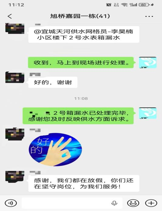 “感謝,我們都在放假,你們還堅(jiān)守崗位,為我們服務(wù)!”10月5日11時(shí)08分,宜城市旭橋嘉園小區(qū)業(yè)主李女士在小區(qū)業(yè)主群里,向襄陽水務(wù)集團(tuán)宜城天河供水有限公司網(wǎng)格員李昊楠發(fā)來感謝消息。而就在23分鐘前,她剛反映家中停水問題,現(xiàn)在水管故障已徹底解決,如此高效的服務(wù)響應(yīng)讓業(yè)主倍感貼心。
